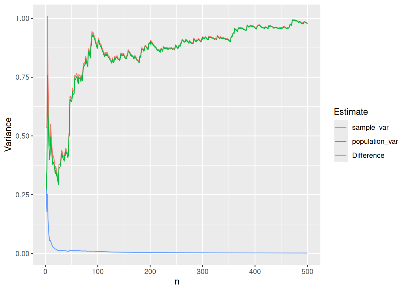 Figure @ref(fig:fig-variance-convergence) depicts the two variances along with the difference for sample sizes rangine from 2 to 500. The blue line representing the difference is very close to zero when n = 200.